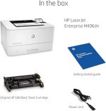 HP LaserJet Enterprise M406dn printer; HP Black Original LaserJet Toner Cartridge (~3,000 pages); Getting started Guide; 1 Power cord